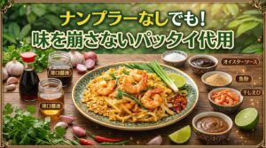 ナンプラーがない時の代用は?パッタイの味を崩さない置き換え一覧ナンプラーがなくてもパッタイは作れる。代用のコツは“塩味”だけで置き換えず、魚介の旨味と香りを補うこと。おすすめ順の代用品、配合目安、味見順とNG例まで解説。 -