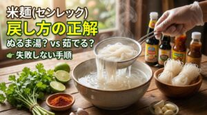米麺(センレック)戻し方の正解|ぬるま湯?茹でる?失敗しない手順パッタイ成功のカギは米麺(センレック)の戻し方。ぬるま湯・水・茹でる方法の違い、最適な戻し時間、芯が残る正解の見極め、ベチャつき・くっつき防止まで解説。 -