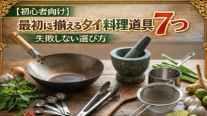 【初心者向け】最初に揃えるタイ料理道具7つ|失敗しない選び方タイ料理に合う調理器具を厳選解説。計量スプーンの必要性、強火×短時間を再現する中華鍋とフライパンの選び方、便利ツール(トング/温度/すり鉢)まで網羅。失敗が減る“買う順番”も紹介。 -