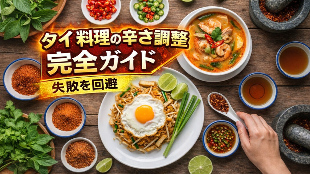 タイ料理の辛さ調整を完全解説。唐辛子の種類(生・乾燥・粉・ペースト)と特徴、辛くしない作り方、子ども向けの分け方、辛すぎた時の復活テク、料理別の辛さ設計まで網羅。 -