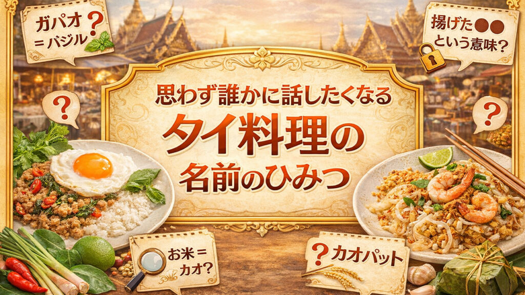 タイ料理の名前には意味があります。ガパオ、トム、ヤム、パットなど、よく見る単語の意味を人気メニューと一緒にやさしく解説。意味がわかると、メニュー選びも料理理解もぐっと楽しくなります。 -