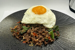 ご飯にガパオをのせ、目玉焼きをのせて完成。