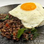 ガパオ・ヌアサップは、鶏のガパオよりもコクと香ばしさが強いのが特徴。 牛ひき肉の旨みが濃いぶん、味付けはシンプルでも“屋台っぽさ”が出やすい一皿です。 このレシピでは、家庭のフライパンでも再現できるように、香りを立てる順番と水っぽくしない火入れを徹底的にわかりやすくまとめました。